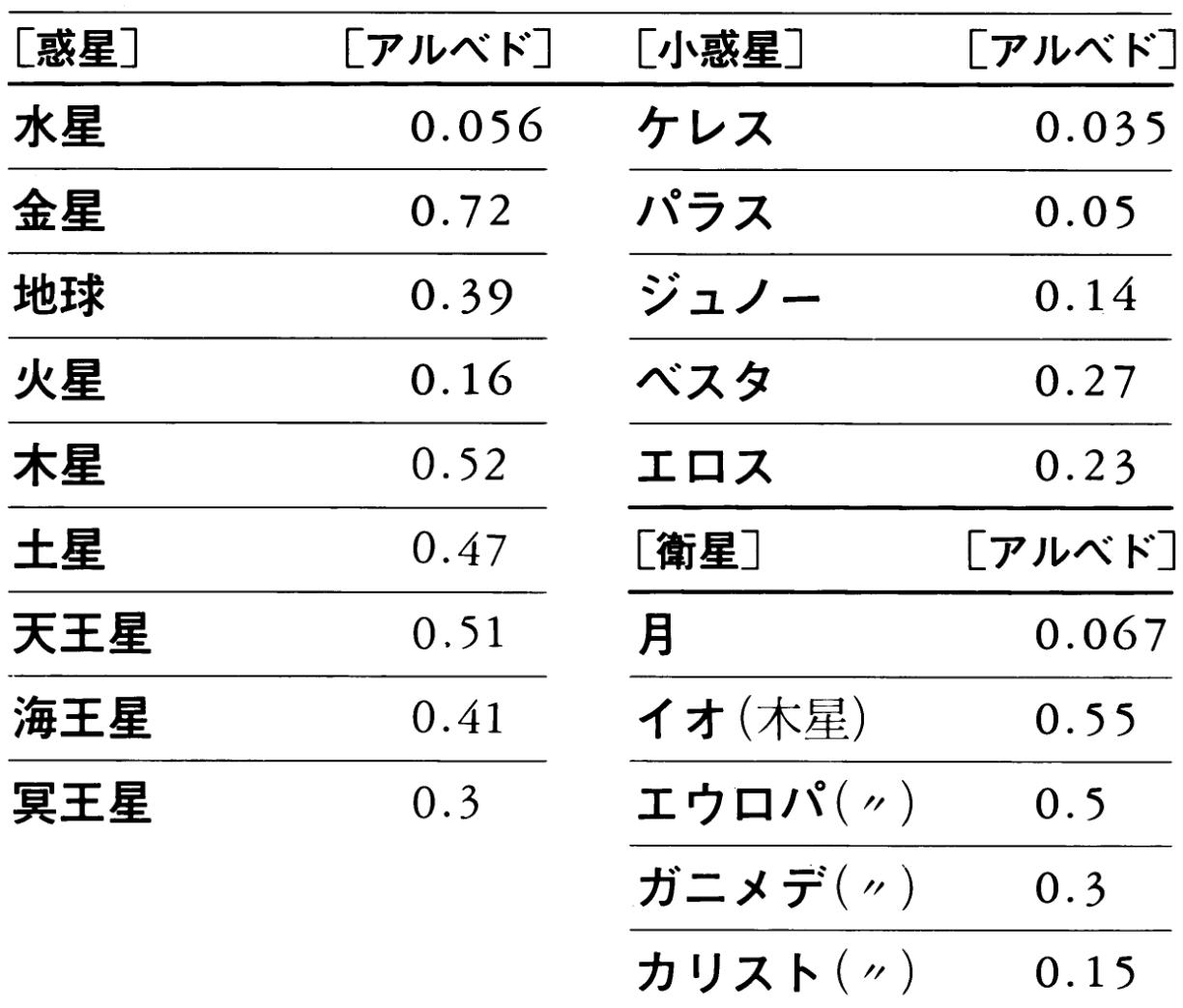 2. 惑星とおもな小惑星·衛星のアルべド。
