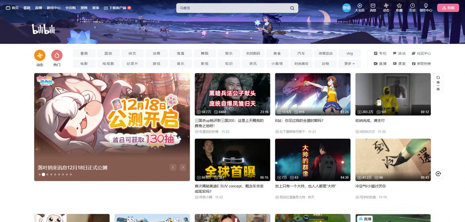 Bilibili(ビリビリ)は、中国における若者向けのトレンド文化・エンターテインメントコミュニティを代表する動画プラットフォームです。アニメ・漫画・ゲーム(ACG)文化を起点として発展し、現在ではアニメ、ゲーム、テクノロジー、ライフスタイル、知識共有など20以上のカテゴリーに拡張されています。ユーザー生成コンテンツ(PUGV)を中心とした多様なコンテンツエコシステムを形成している点が特徴です。