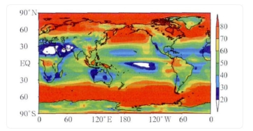 1. 1979年から2009年における全球平均総雲量分布。