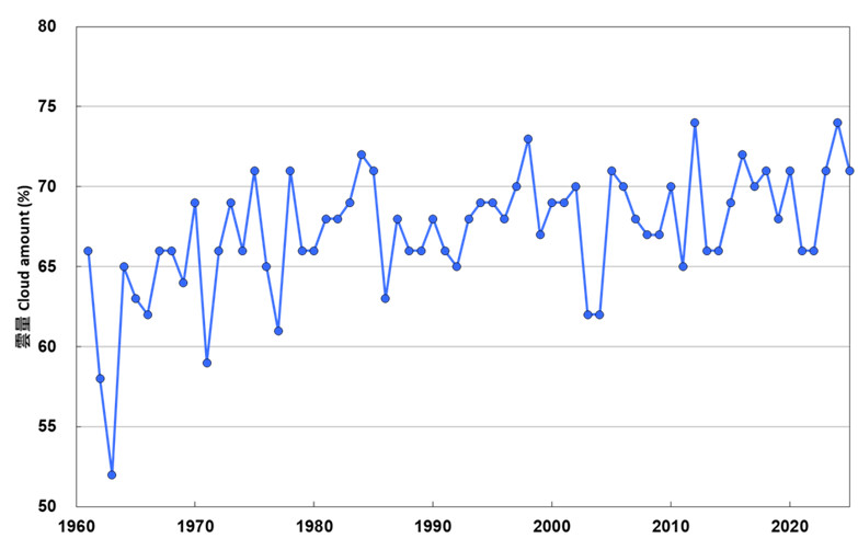 2. 観測所本部で記録された年間平均雲量(1961–2025年)。