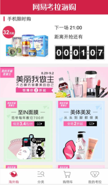 1. 考拉海購アプリのホームページ画面。