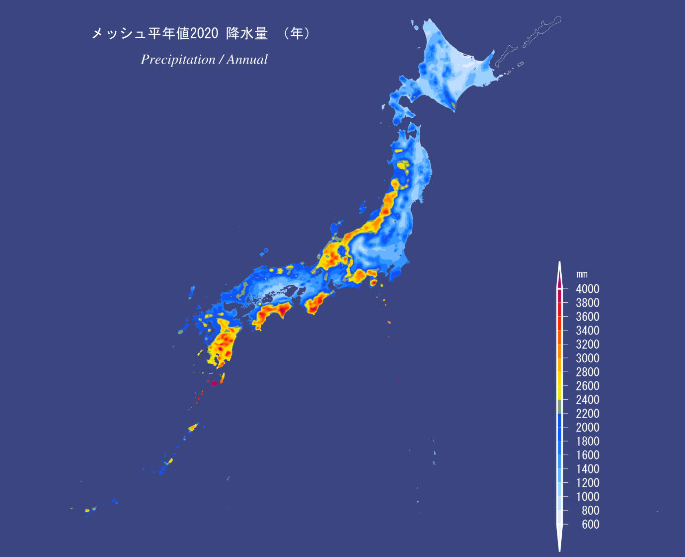 2. メッシュ平年值2020 降水量(年)。