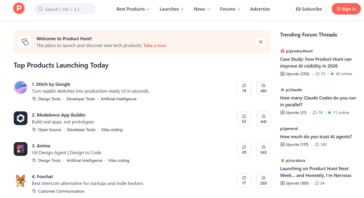 1. Product Hunt のホームページ。