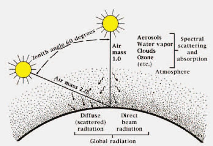 1. 太陽からの直射光線の光子が大気によって散乱されると、AMに応じて変化する拡散放射線が発生します(Marion et al. 1992より)。